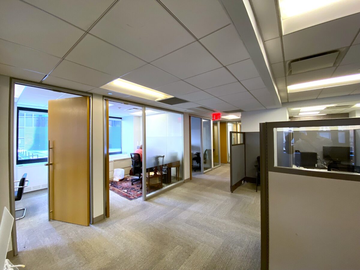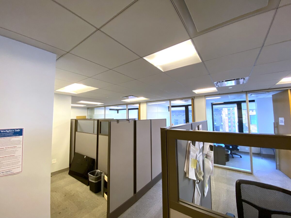 The configuration of the space for rent is 6 private offices and 40 desks/cubicles. The unit has double glass door entrance, sleek polished concrete floors, raw exposed ceilings, and furnished. The furniture is very high which blocks the view of the rest of the office but it keeps the space more quiet. The pantry is also nice and can be ap place for employees to hang out after they grab a coffee. All the offices have glass fronts. The unit faces South and West and gets plenty of light.