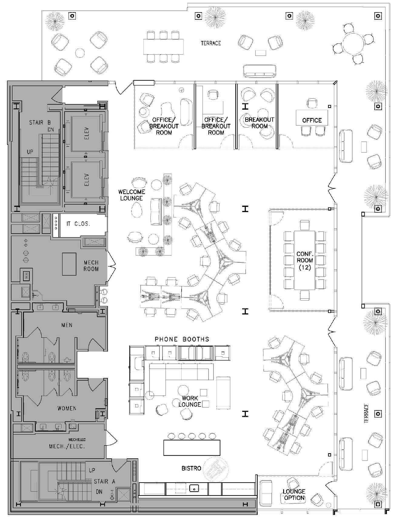 The layout includes open work areas, conference rooms, breakout rooms, phone booths, and multiple lounge spaces. A dedicated bistro and welcome lounge support both everyday work and client-facing meetings. The private terrace adds valuable outdoor space for informal use.
