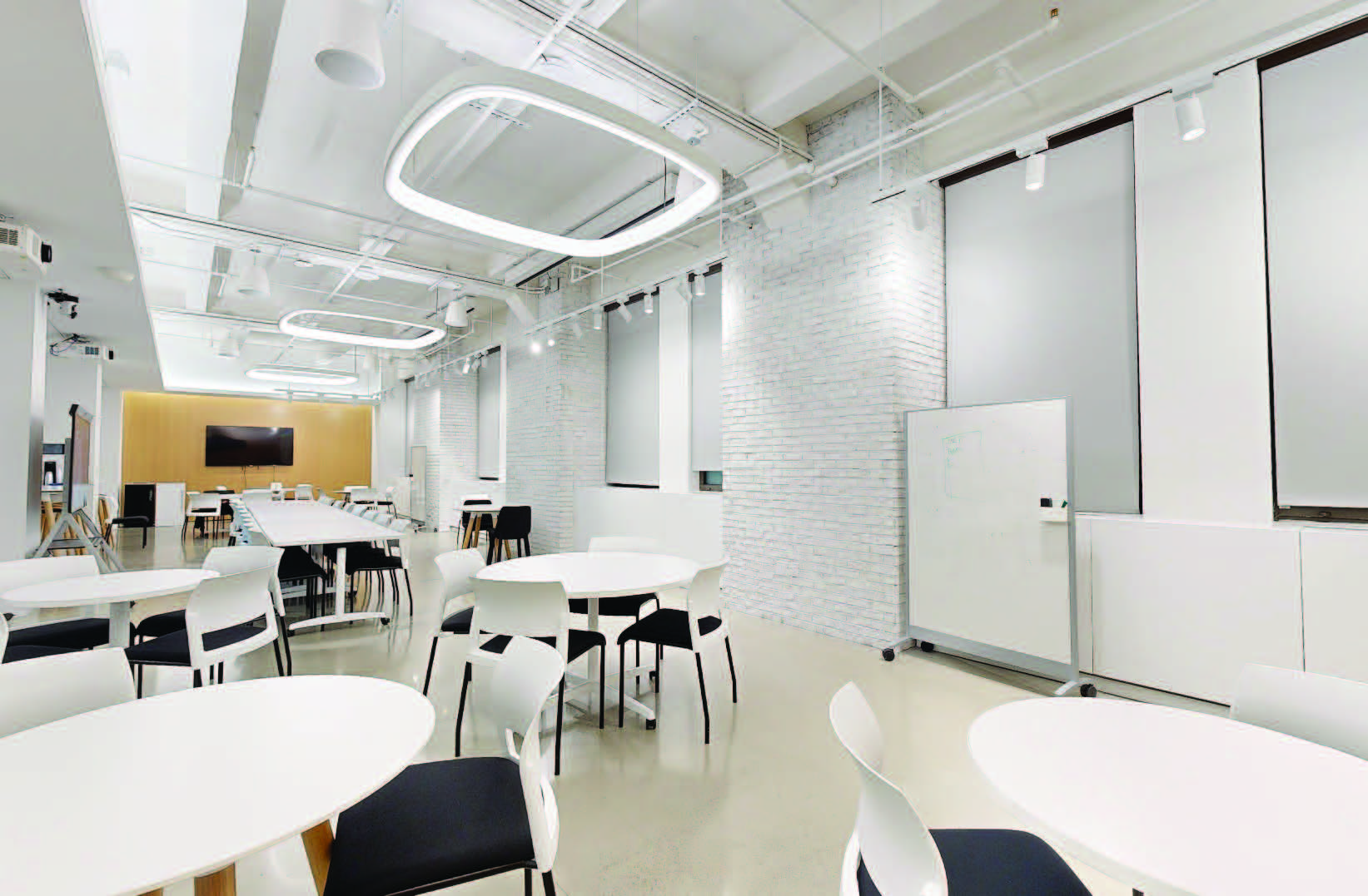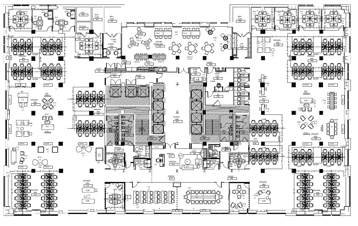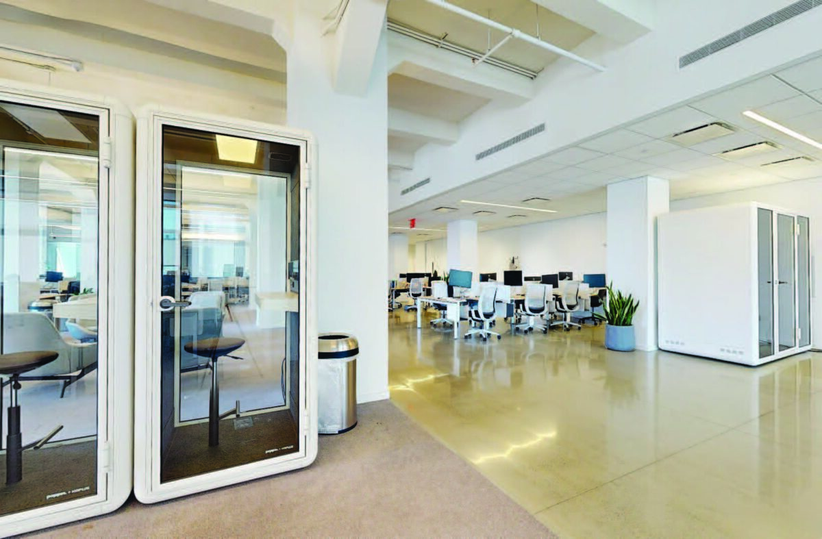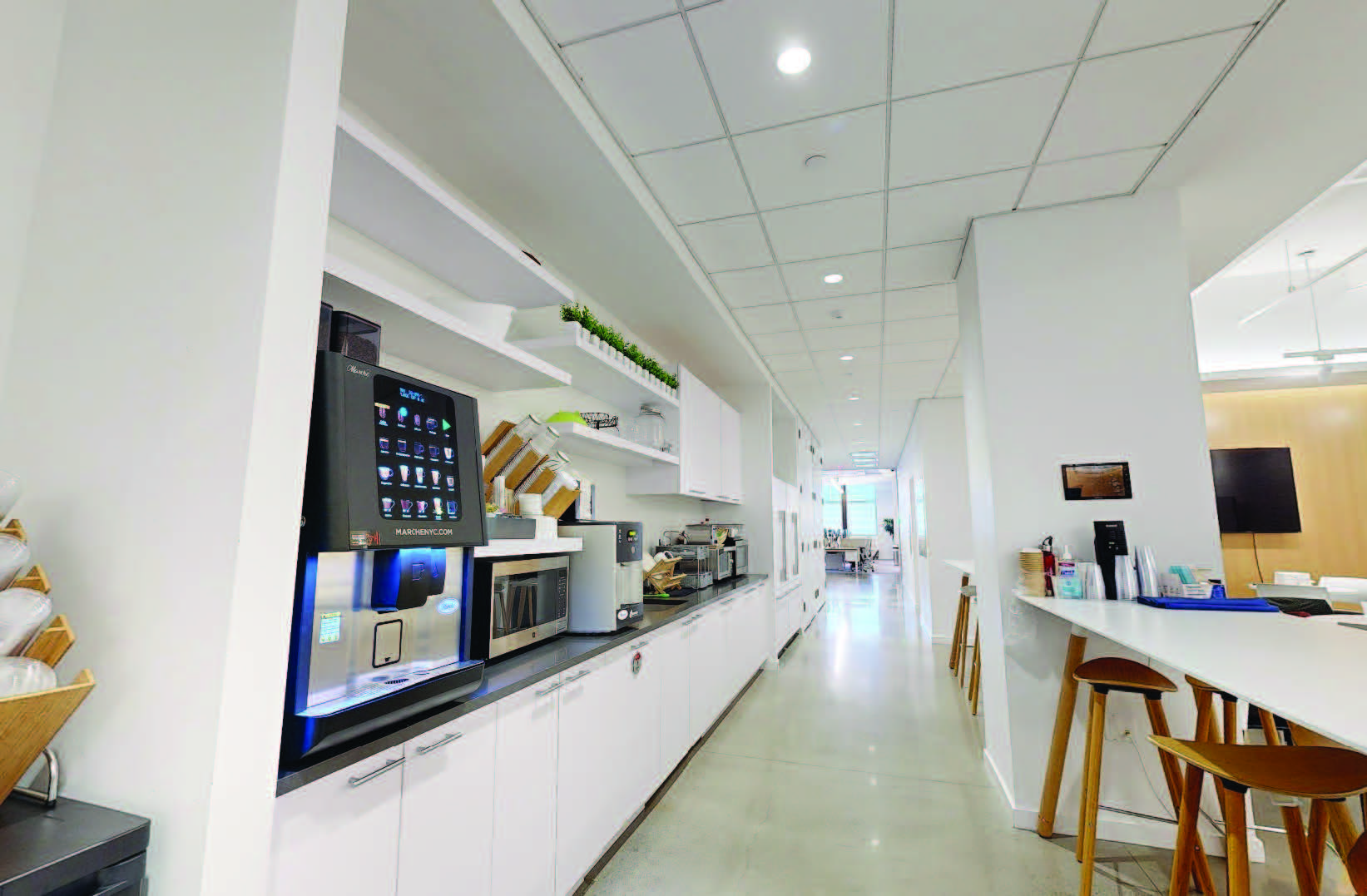 The layout is designed for scale and flexibility, combining large open work areas with interior meeting rooms and private offices. The space includes multiple conference rooms, phone rooms, a wellness room, and a large open kitchen and pantry that supports daily use and team gatherings. The design works especially well for tech, creative, and collaborative teams.