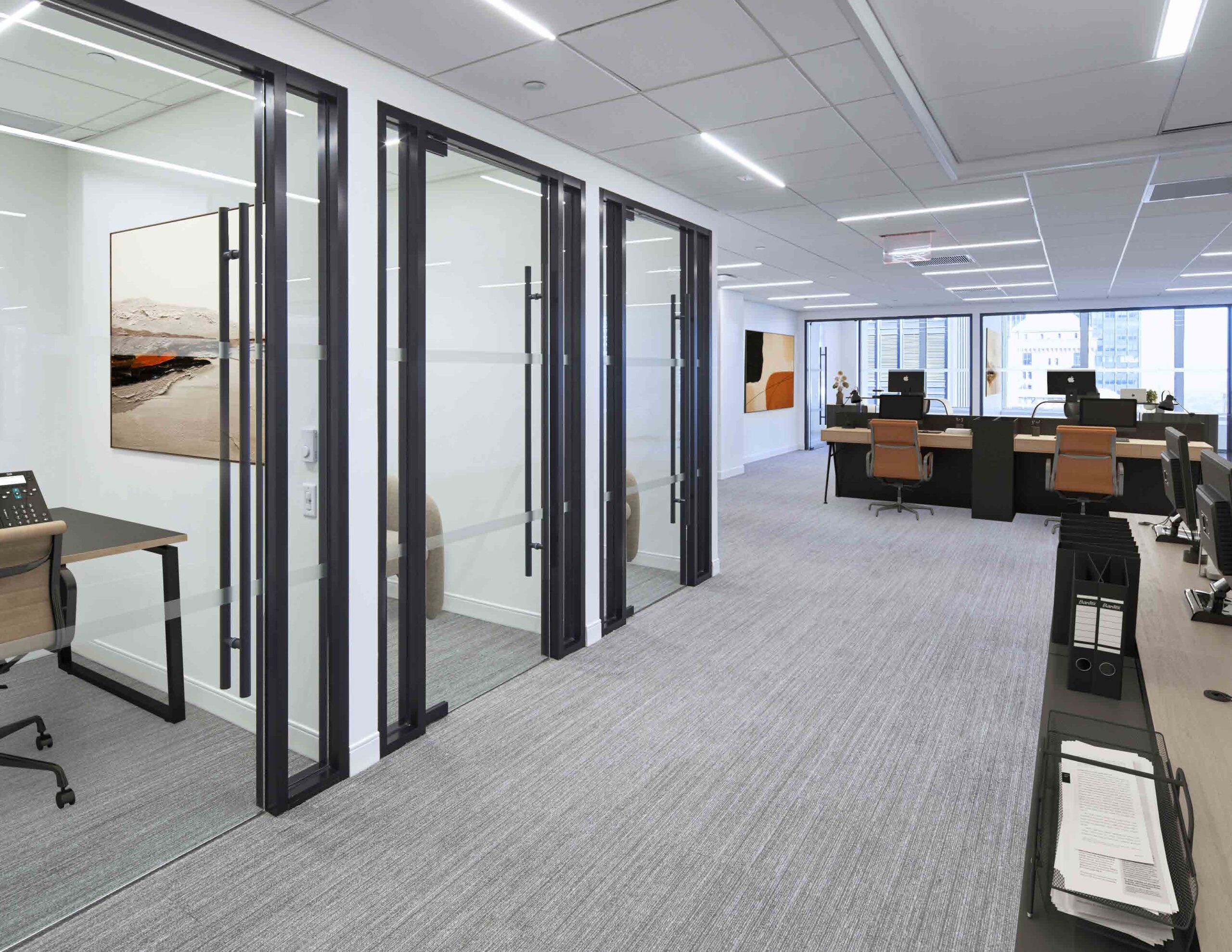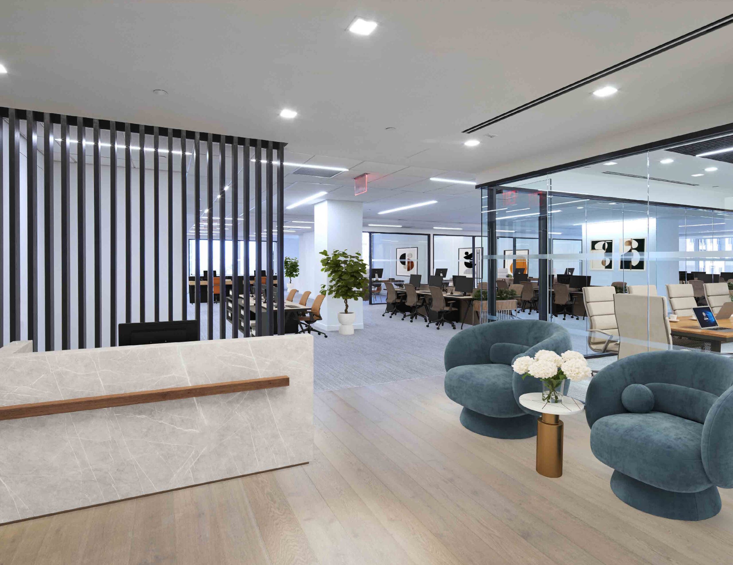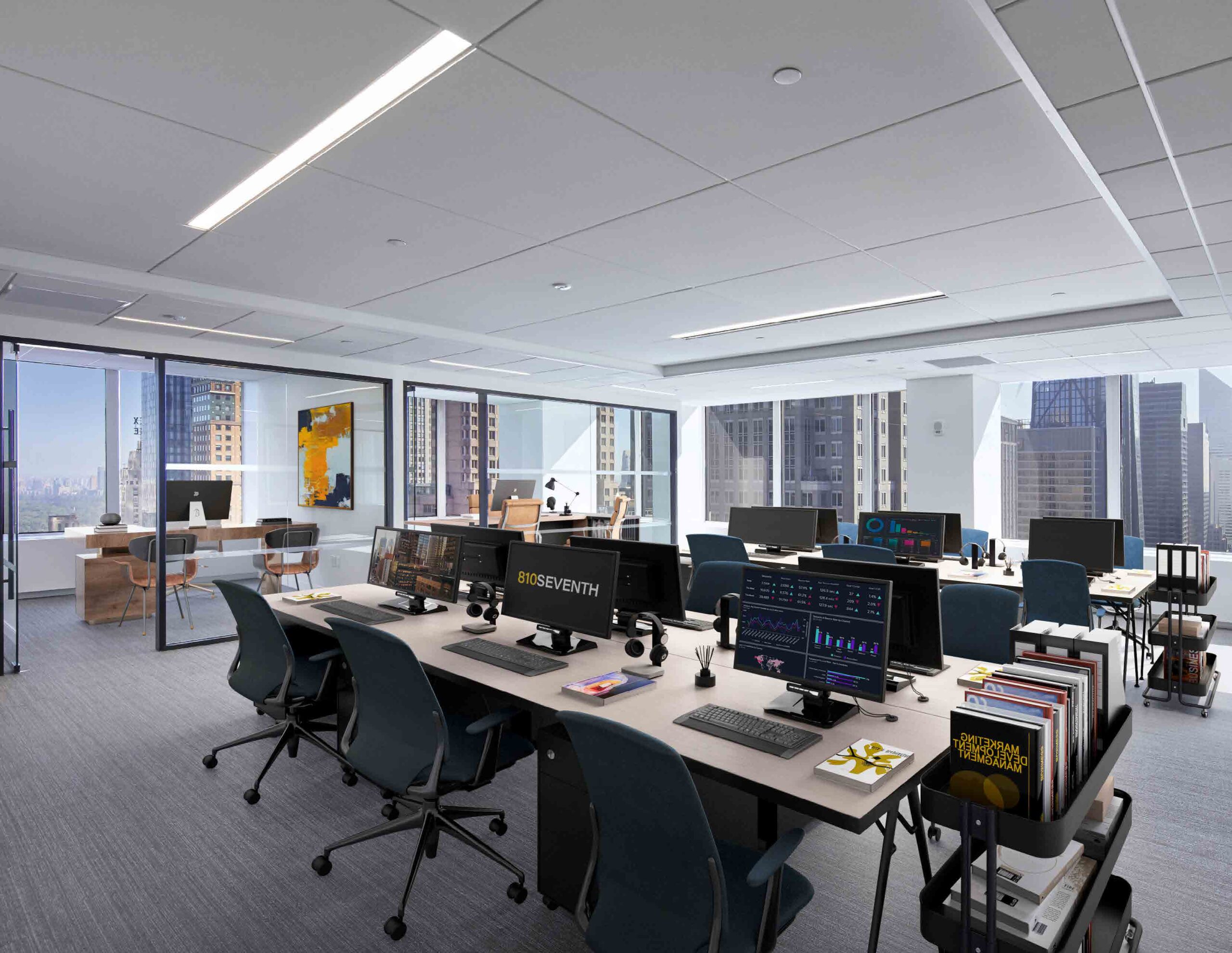 810 Seventh Avenue offers modern, prebuilt office spaces designed for teams that want to move in and get to work. The building features next-generation furnished units with efficient layouts, abundant natural light, and high-quality finishes. Many spaces include glass-fronted offices, conference rooms, pantries, and reception areas that support both focused work and collaboration.