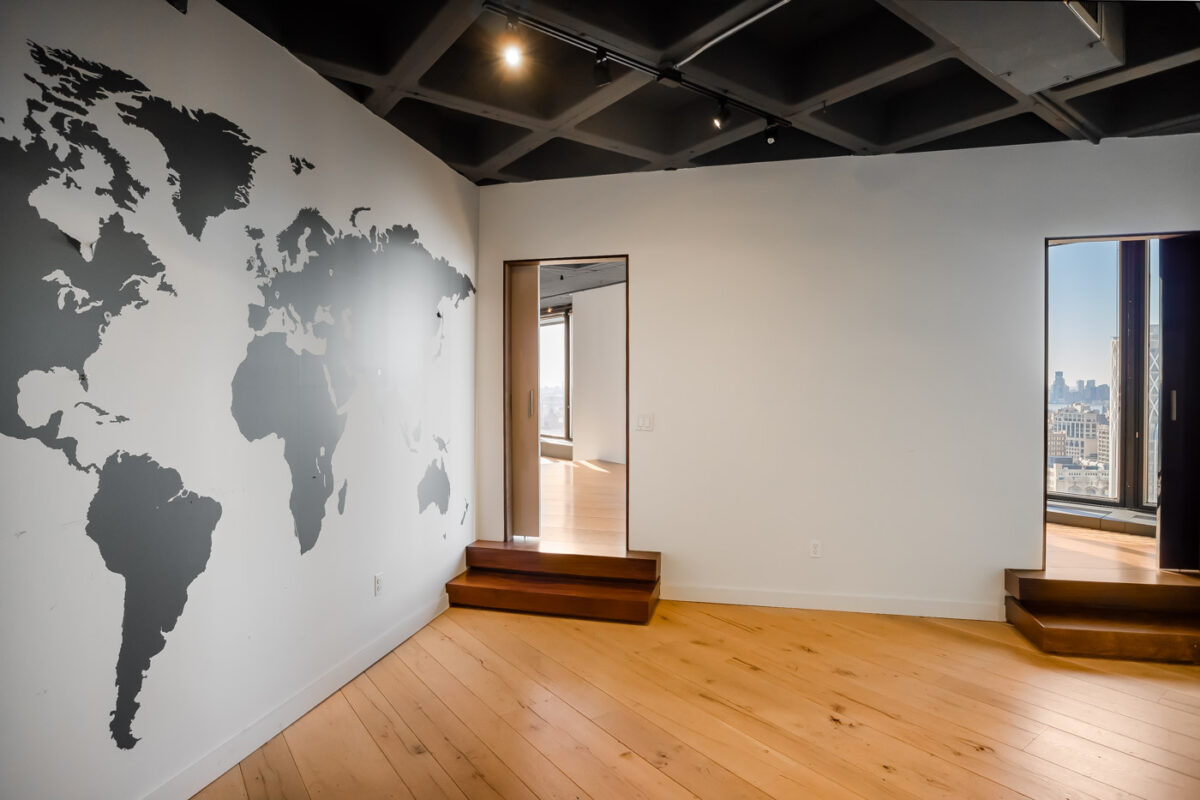 This beautiful showroom office space with amazing views in NYC has floor to ceiling glass windows and designed impeccably.
