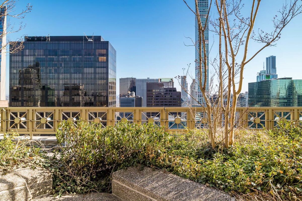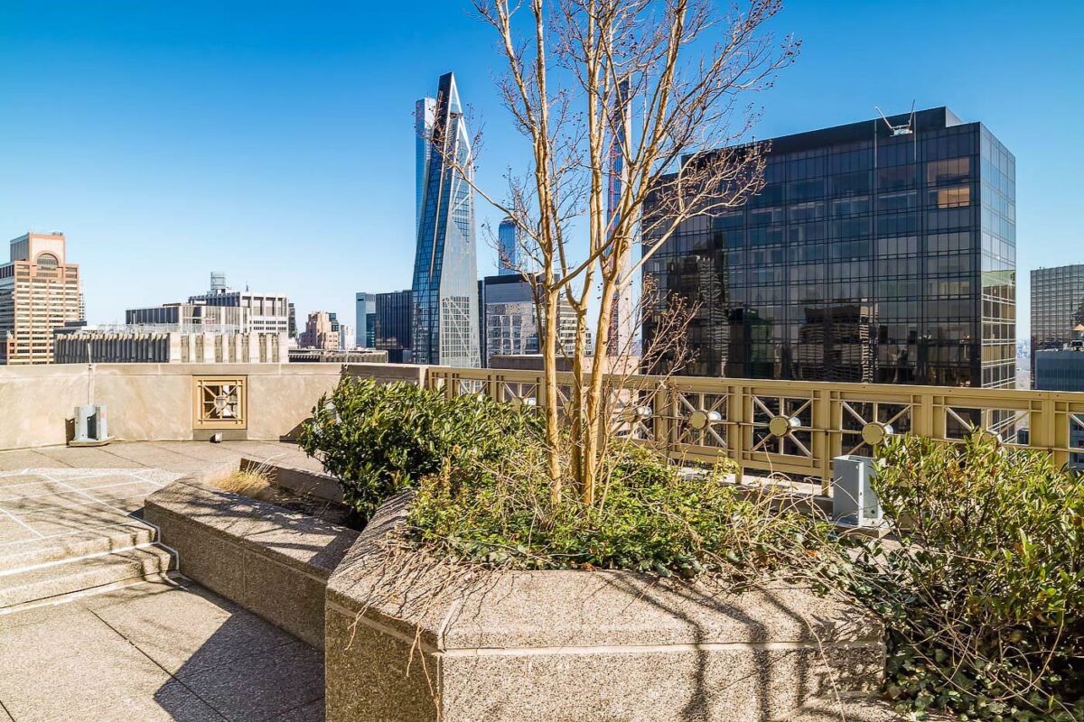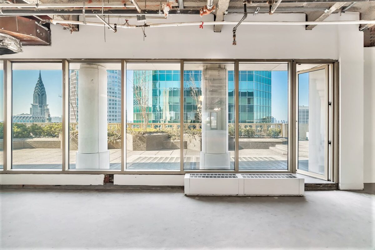 This Manhattan office space for lease is a terrace penthouse that sits atop the building also known as Swiss Bank Tower, an iconic office building constructed adjacent to Saks Fifth Avenue. The two terraces here are huge. Each terrace is 5,000 sf and landscaped. This is an ideal spot to have all hands on meetings, industry events and corporate functions.
